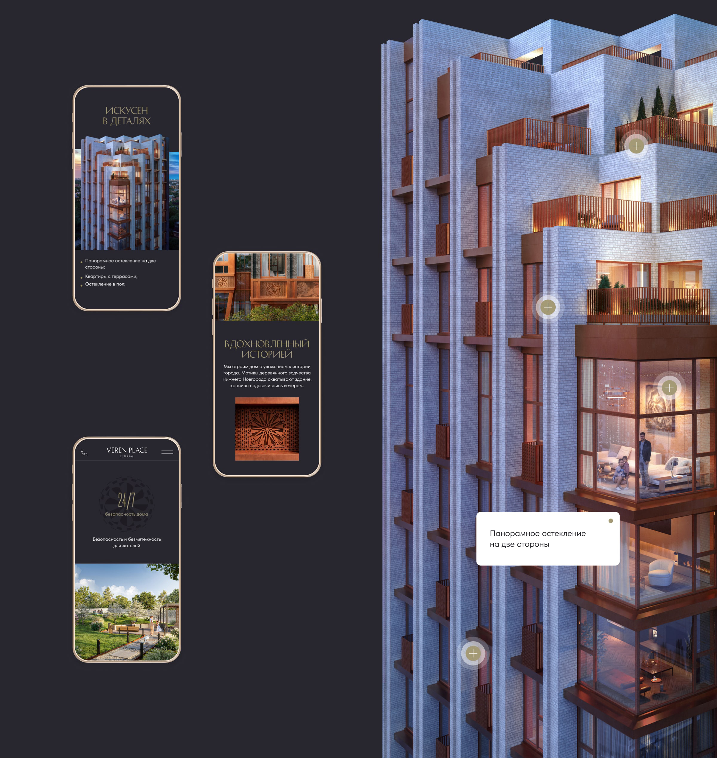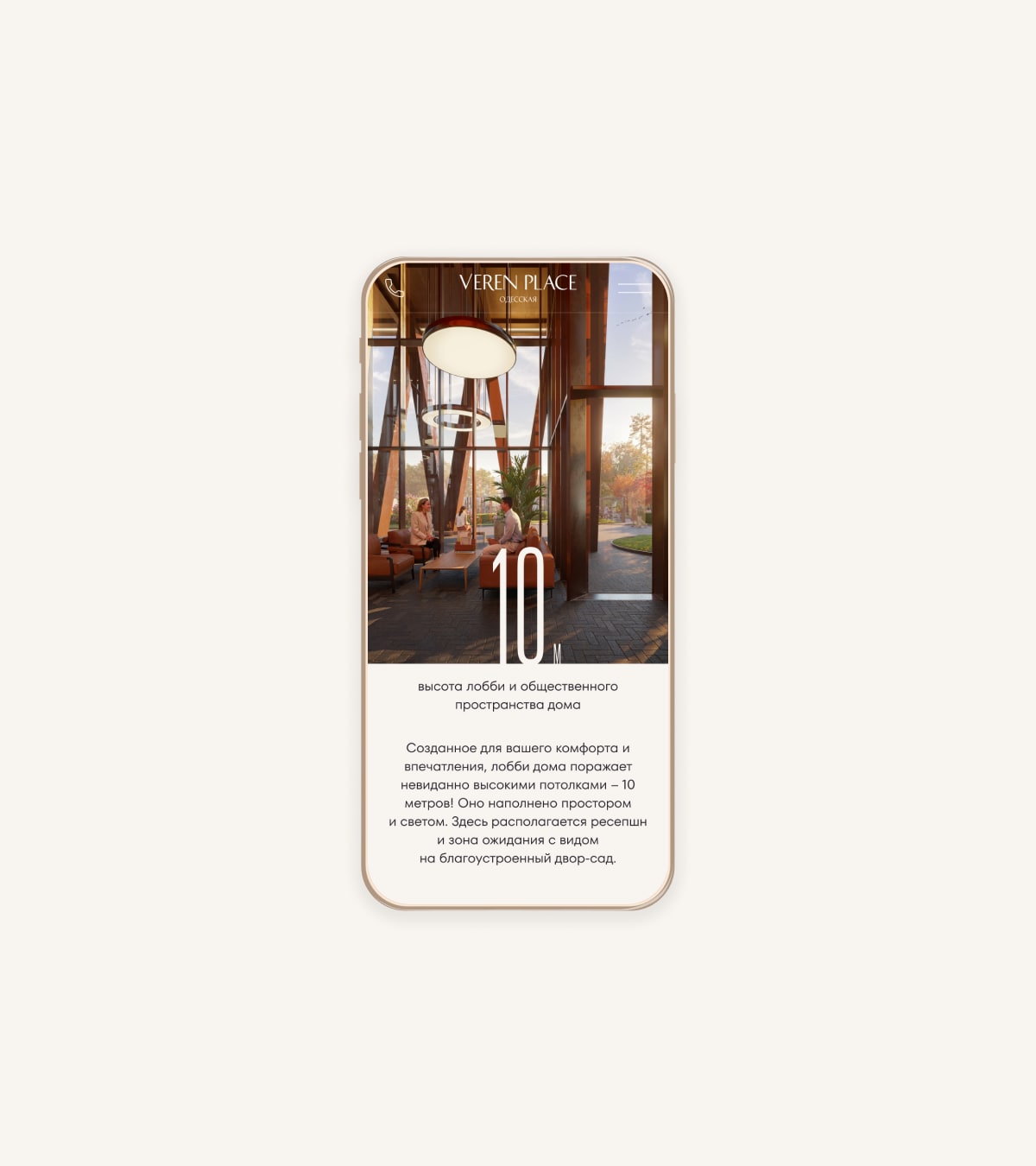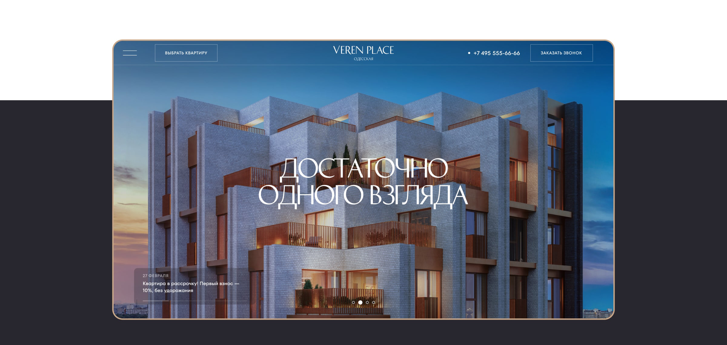 Сайт максимально эффектно презентует преимущества жилого комплекса. Лонгрид-страницы подробно описывают выгоды предложения, подчеркивая, что Veren Place Одесская – особенный дом, исполненный с уважением к истории, притягивающий взгляды, наполненный продуманным комфортом.