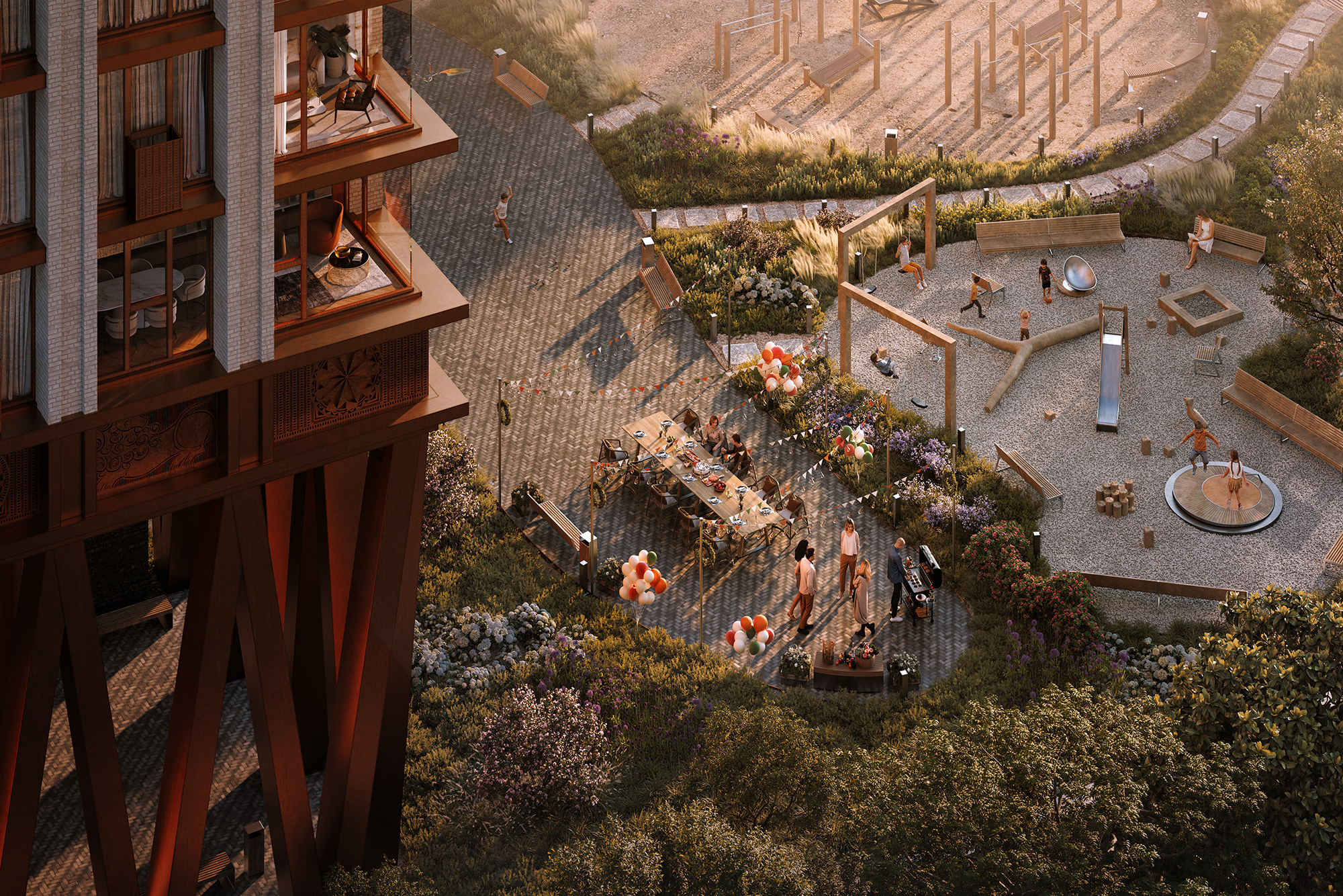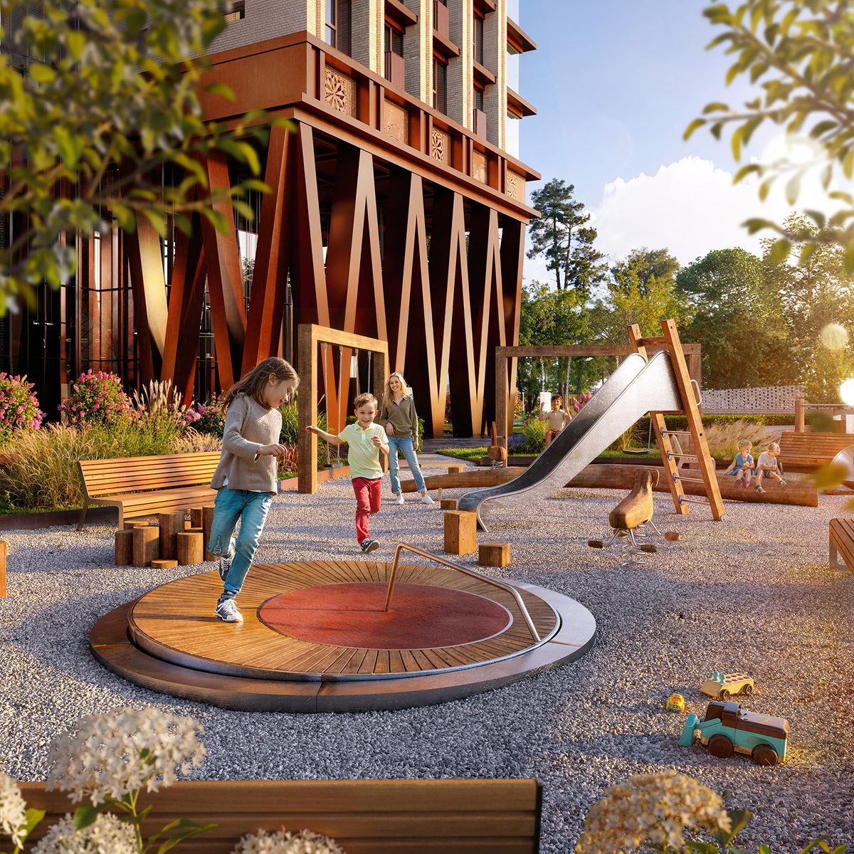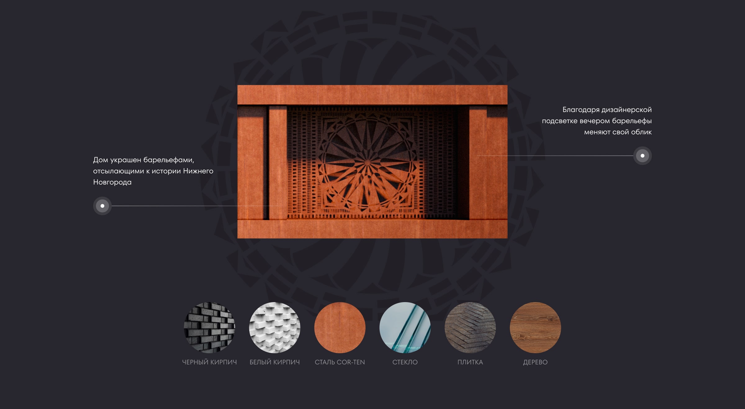 Контент спродюсирован и создан специально для сайта – впечатляющие 3D-визуализации выгодно преподносят дом и его детали, аэрофотосъемка передает захватывающие панорамы, которыми будут любоваться жители комплекса. Фотосъемка окружения раскрывает преимущества расположения.
