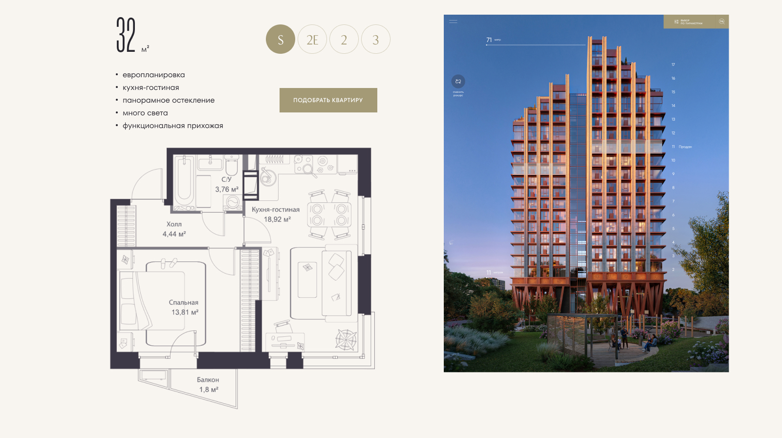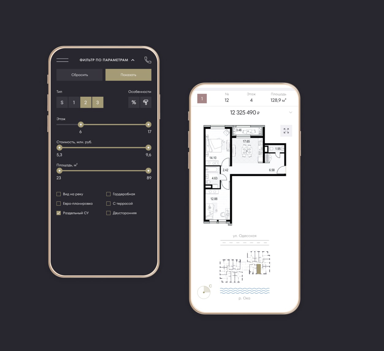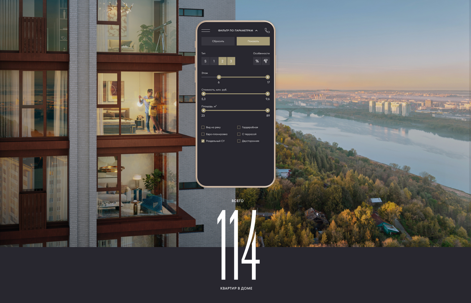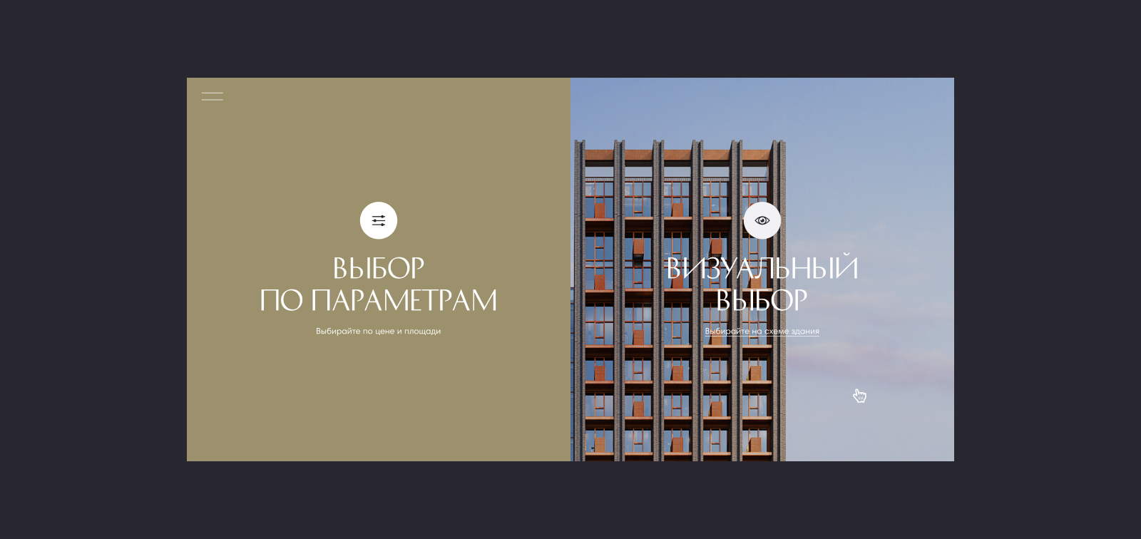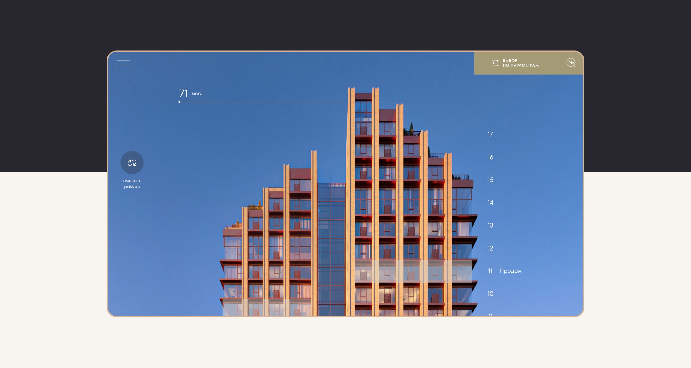 Вдохновившись преимуществами проекта на имиджевых страницах, пользователь переходит в удобный выборщик квартир. Его интерфейс отличают визуальная простота, интуитивность, наглядность и полнота информации о квартире. Визуальный выбор одновременно знакомит клиента с оригинальными фасадами дома.